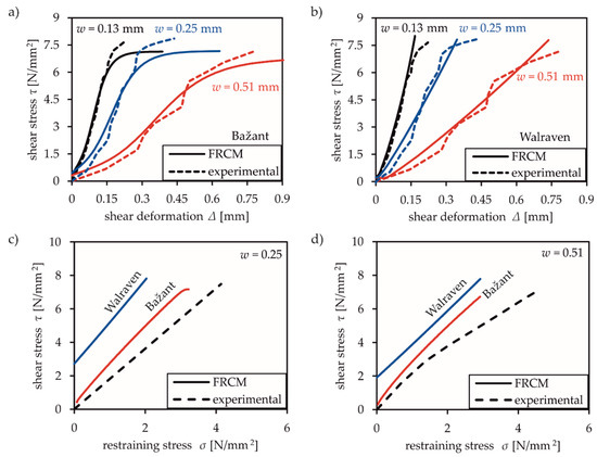 Figure 12 illustrates the experimental results by Paulay for different crack openings. Figure 12a,b show the relation between transferable shear stress and shear deformation while Figure 12c,d show the resulting normal or restraining compressive stresses in relation to the shear stresses. The experimental results represent the averaged values, where the shear deformations were experimentally determined above and below the crack. Using Bažant’s aggregate interlock law (cf. Figure 12a), FRCM predicts the transferred shear stresses as well as the resulting normal compressive stresses for all crack openings with reasonable agreement. This also applies to the numerical results where Walraven’s aggregate interlock law was applied (cf. Figure 12b). For the effect of compressive normal stresses, illustrated in Figure 12c,d, the usage of FRCM with Bažant’s aggregate interlock model gives the best prediction of experimental results, while Walraven’s model requires higher shear deformations to activate compressive stresses. Reviewing the numerical predictions of Nooru-Mohamed’s [20] and Hassanzadeh’s [19] test data shows that inappropriate laws for small aggregate sizes (smaller than 8 mm) seem to be the reason for occurring deviations.