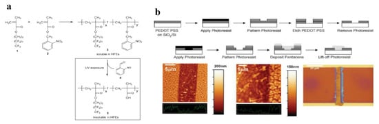 More recently, o-NBE-based photoresists were successfully adopted for the patterning of organic light-emitting diode (OLED) displays and organic thin-film transistors (OTFTs). An interesting work in this sense was made by Taylor and co-workers in 2009 []. They synthetized a photoresist based on a co-polymer that contains monomers with highly fluorinated groups and methacrylic nitrobenzyl ester monomers (Figure 2). After photolysis of the o-nitrobenzyl ester groups, the co-polymer became insoluble in hydrofluoroethers solvents allowing selective network dissolutions. Taking advantages from the photo-switchable solubility properties, the synthetized photoresist was employed as photo-pattern system on PEDOT: PSS films. The results showed a sub-micrometer patterning, and, generally higher performance compared to other chemically amplified techniques for PEDOT: PSS photo-patterning. As a further application, they were able to fabricate a field-effect transistor, in which an organic semiconductor material (pentacene) was patterned on the PEDOT: PSS coating.