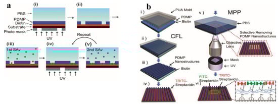 The possibility to fabricate photoresist with high resolution and in mild reaction conditions were widely explored for the fabrication of protein microarrays. Different works in this sense were conducted by Doh and co-workers []. They synthetized a terpolymer (o-NBEMA-MMA-PEGMA) containing an o-nitrobenzyl methacrylate (o-NBEMA), methyl methacrylate (MMA), and poly(ethylene glycol)methacrylate (PEGMA) for preparing thin photo-responsive films. The patterns were accomplished after UV illumination, by dissolving the irradiated polymer area in a phosphate buffer solution with a pH above 6.6. Further conjugation of biotin to the hydroxyl end groups of PEGMA units allowed selective immobilization of streptavidin on the surface, enabling a multicomponent protein patterning (Figure 3).