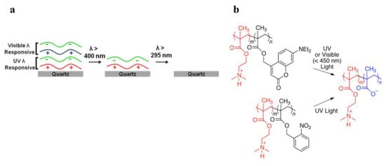 (a) Schematic illustration of the de-assembly process through different wavelength irradiations. (b) Design of photosensitive polycations that reduced net charge upon irradiation with either visible (coumarinyl groups) or UV (coumarinyl or nitrobenzyl groups) light (Reprinted with the permission from reference [] Copyright 2014 American Chemical Society).