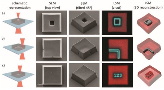 Laser erasing schematic procedure and SEM pictures of the printed micrometric (15 × 15 × 5 µm3) blocks using a 700 nm femtosecond laser. (a) 3 ×3 × 3 µm3 block, (b) 90° 1 µm diameter tunnel, and (c) simple text “123” (Reprinted with the permission from reference []).