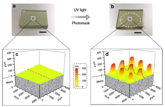 The swelling solution was instead composed by 4-hydroxybutyl acrylate (monomer), 1,6-hexanediol diacrylate (crosslinker), I-819 (photoinitiator), and benzenesulfonic acid (BZSA) as transesterification catalyst. The basic swelling mechanism was the following: upon light exposure, the solution on the irradiated area photopolymerizes, and consuming the monomers, creates a concentration gradient of monomers and crosslinkers (swelling solution) to the irradiated areas. In this way, unreacted species diffuse to the irradiated regions and swells the polymer surface. In addition to this mechanism, the photolysis of the o-NBE groups releases ionizable carboxylic acid groups, which enhance the swelling ability of the irradiated region, by expanding the polymer networks via COO−–COO− electrostatic repulsions. The combined effect caused a localized swelling of the irradiated network surface, with the formation of micro-pillars (Figure 7). The presence of o-nitrobenzyl ester groups was crucial for enhancing the swelling process.