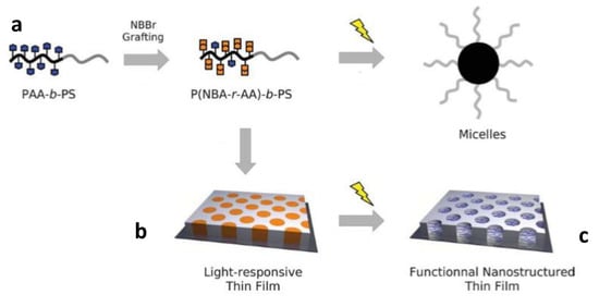 Schematic representation of light-responsive behavior of P(NBA-r-AA)-b-PS photocleavable block copolymers (a) light-induced micellization in a selective solvent of PS, (b) self-assembly in thin film with a cylindrical morphology, and (c) light exposure leading to functional and nanostructured thin films (Reprinted with permission from reference []).