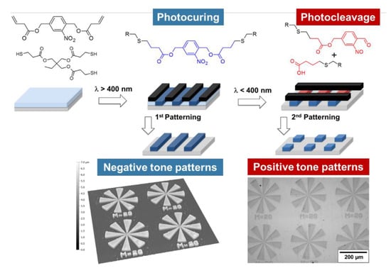 The design of photocleavable “thiol-click” photopolymers by introducing o-NBE chromophores was reported by Radl and co-workers in 2017 []. Radical-mediated thiol-ene photopolymerization of a photo-sensitive alkene(2-nitro-1,4-phenylene)bis(methylene) acetate with multi-functional thiols yielded polymer networks with photosensitive covalent links. The curing of the monomers was carried out by visible light exposure using phenyl bis(2,4,6-trimethylbenzoyl)-phosphine oxide as long wavelength absorbing photoinitiator (λ = 360–440 nm). The absorbance of the initiating system did not interfere with the absorbance of the o-NBE links, as vinyl-NBE absorbs below 380 nm. Thus, efficient photoinitiation of the thiol-ene reaction was accomplished without electronically exciting the photosensitive vinyl-NBE. Going beyond the fabrication of positive tone patterns, the spatial and temporal control of the photocuring process enabled the fabrication of complex two-dimensional polymer patterns with photo-responsive properties. Microstructures with a resolution of 4 µm were accomplished by dissolving the cleaved networks in organic solvents (Figure 10).