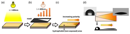 - Rossegger, E.; Hennen, D.; Griesser, T.; Roppolo, I.; Schlögl, S. Directed Motion of Water Droplets on Multi-Gradient Photopolymer Surfaces. Polym. Chem. 2019, 10, 1882–1893. [Google Scholar] [CrossRef]