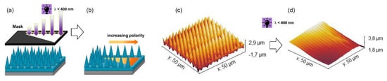 Taking advantages of this effect, in a further work, Rossegger and co-workers [] increased the wettability gradient by introducing a needle-like micropatterns on the sample surface, with visible light-assisted nanoimprint lithography (NIL). In order to increase the mechanical properties of the coating, for the light-assisted NIL procedure, they prepared a thiol-acrylate photopolymer with a higher Tg. For the sample preparation, an o-nitrobenzyl alcohol derivative with terminal acrylate groups (acrylate-NBE) was synthetized and cured upon visible light exposure in the presence of multi-functional thiols, isobornyl acrylate, and a fluorinated methacrylate. The combined effect of the needle-like microstructures and the fluorine groups increased the surface hydrophobicity, with static water contact angle of 140°. Under UV light irradiation, not only the chemical surface composition but also a photoablation of the microstructures was observed (Figure 12). With this combined effect, they were able to increase the surface hydrophilicity in a controlled manner and obtained photopolymer surfaces with a water contact angle of 7°. The higher wettability gradient, in combination with a Laplace pressure gradient (V-shaped pattern), was exploited in order to move a water droplet over a distance of 22 mm, double than the distance reported in the previous work (Figure 12).