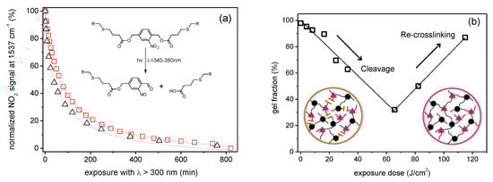 This behavior was confirmed by sol-gel analysis of thiol-click networks with o-NBE chromophores as function of UV irradiations dose [,,,]. As shown in Figure 13b, after a first decrease of the gel content, the network followed a re-crosslinking process, thus decreasing the amount of the extractable soluble species. As shown by solid state NMR experiments, this mechanism is mainly related to azobenzene side products, which are formed by a dimerization of the nitroso-benzaldehyde. These side reactions limit the performance in photoresist applications.