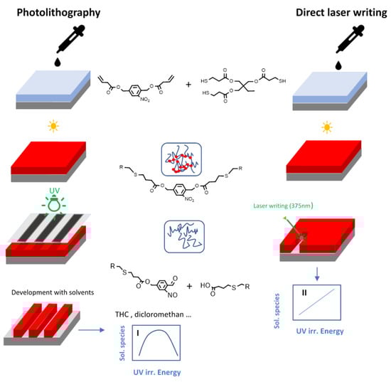 Comparison between photolithography and direct laser writing for the introduction of micropatterns in photosensitive thiol-ene networks (Reprinted with permission from reference []).