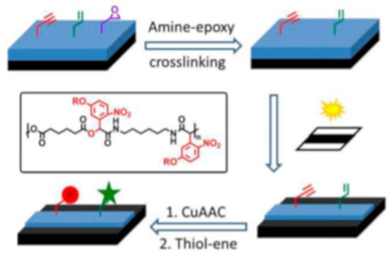 Thiol-click reactions have been also widely explored as facile and efficient coupling procedures in surface modifications []. As regard to this, Li and co-workers [] accomplished photolabile network containing both o-NBE and “clickable” groups, in order to realize photoresists with “click” modifiable surfaces (Figure 15). They synthetized three different monomers containing o-NBE links and with three different functionalities; allyl (M1), propargyl (M2), and epoxy (M3). In a second step, polymer chains were accomplished through Passerini MCP reactions, containing the synthetized monomers (M1, M2, and M3), 1,6-hexanedioic acid, and 1,6-diisocyanohexane. The synthetized polymer chains were then crosslinked through amine-epoxy reactions, coupling the epoxy groups (M3) of the polymer chains and diethylenetriamine monomers. The o-NBE groups of the amine-epoxy networks were then exploited as decrosslinking points for fabricating positive tone photoresists. In a further step, the allyl and propargyl groups on the photoresist surface were used as “clickable” points, for anchoring fluorescent molecules with copper(I)-catalyzed azide alkyne cycloaddition (CuAAC), and thiol−ene reactions (Figure 15).