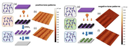 The control of the self-assembly process of the copolymer blocks, and domains orientation, still represents an ambitious challenge in coating applications. Several works have shown the influence of the substrate on the orientation of the structure domains of a coated block co-polymer [,]. In a recent work, Sol and co-workers [] proposed an interesting approach in order to control the domains’ orientation of a coated co-polymer blocks, by photo-controlling the substrate wettability. They fabricated a substrate with photo-responsive wettability based on a block copolymer of poly(styrene-r-2-nitrobenzyl methacrylate-r-glycidyl methacrylate). Because of the release of hydrophilic carboxylic acids under UV light, they were able to change the substrate’s surface polarity. In a subsequent step, by coating block copolymers of poly(styrene-b-methyl methacrylate), they demonstrated that the different substrate wettability was a crucial factor in the self-assemble process of the coated block co-polymer, co-(PS-b-MM), into lamellar or cylinder-forming domains. Particularly, they were able to control the domains’ orientation, from perpendicular to parallel orientation, changing the surface polarity by appropriate UV exposure dose.