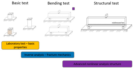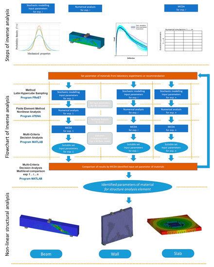 The design approach of inverse analysis includes the utilization of a series of methods, in particular the use of a multi-criteria analysis [14] for the decision-making process of material characteristics identification in combination with a nonlinear analysis and stochastic modelling. There are many approaches to inverse analysis such as decision trees, network models, neural networks, balance models, fuzzy logic or multi-criteria decision analysis (MCDA) [14]. Information on fracture mechanical properties can be used for a detailed study of a selected research problem. However, analytical methods in design codes often use only limited examples with respect to recommendations and, in some cases, use none at all. Typical cases may include the repair or strengthening of reinforced concrete (RC) structures by fiber reinforced polymer (FRP) [15] and carbon fiber reinforced polymer (CFRP) [16,17].