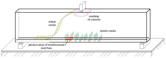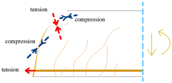 where b is the width of the cross-section, d’ is the depth of beam and τ is shear stress. The shear failure mechanism is shown in Figure 5 [33]. It can be seen from Figure 5 that the shear failure can be divided into part of a crack with tensile or compression areas. The actual formulation of the resulting shear load is further complicated by the steel reinforcement.
