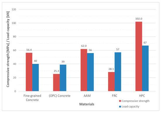 The complexity of the problem of shear failure can be illustrated by comparing the total load capacity for the investigated type of beams in Figure 3, which is made of various concretes from the author’s previous research. All reinforced concrete beams from the experiments had shear failure. A detailed study of values in Table 1 and Figure 4 makes it possible to distinguish that a number of parameters that do not have the same effect enter the overall load capacity.