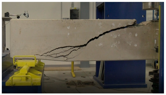The issue of shear failure is also relevant for reinforced concrete beams with shear reinforcement. Figure 6 and Figure 7 show the same type of beams (geometry, reinforcements), which differ only in the material used. These were type A1 beams according to the research program [45,46] and were 4.1 m long with a cross section of 300 × 550 mm. Figure 6 shows a beam with an alkaline-activated material (AAM) [41]. Figure 7 shows a reinforced concrete beam with high-performance concrete (HPC) [42]. In the case of the reinforced concrete beam with high-performance concrete (HPC) [42], the shear failure was located in one significant crack. The collapse of the reinforced concrete beam was sudden. A wider mesh of cracks formed in the reinforced concrete beam with alkaline-activated material (AAM) [41]. It was not until just before the collapse that the crack was significantly localized and gradually collapsed the beam.