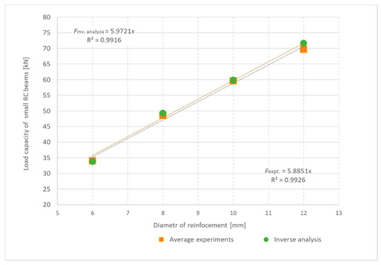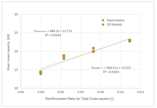 The results of tests and numerical modelling can be interpreted in the form of shear capacity of the beam in Figure 16, depending on the degree of cross-section reinforcement. A shear load regression function was also determined for experiments and numerical models, as shown in Equations (19) and (20):