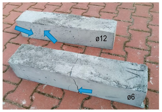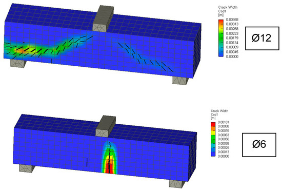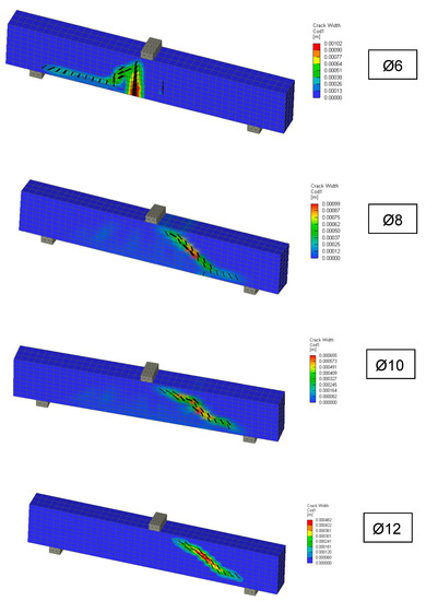 As an example, in Figure 10, a beam with a 6 mm diameter reinforcement and a beam with a 12 mm reinforcement are selected. For small beams with a 6 mm diameter reinforcement, it is apparent that the failure mechanism corresponds more to tensile failure. A beam with a diameter of 12 mm exhibited the failure mechanism of a typical shear crack.