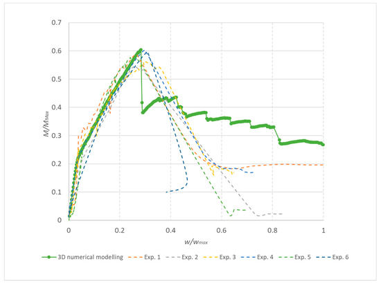 Results for reinforced concrete beams without transverse reinforcement, reinforcement 10 mm: Experiment 1–6 and 3D model.