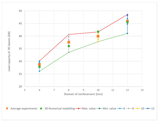 A total of twelve tests were performed in the three bending tests of small reinforced concrete beams with reinforcement, with three beams used for each test series. The resulting bearing capacity is evaluated graphically in Figure 9. The differences in load-bearing capacities in the individual series of reinforcement beams were usually small, although the differences were greater for the 10 mm diameter reinforcement. With a larger reinforcement diameter, the overall load-bearing capacity increases.