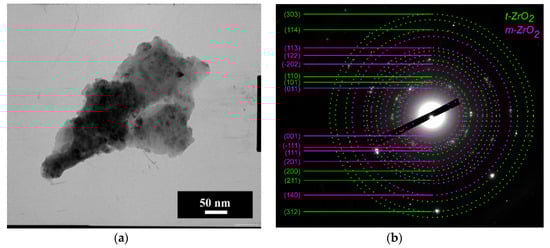 The Miller indexes are presented in Figure 1b. According to ED, the main phase was tetragonal ZrO2 (t-ZrO2) with the reflexes assigned to (101) at 2.97 Å; (002) at 2.61; (110) at 2.5 Å, (200) at 1.81 Å (JCPDS card #79-1768). It is hard to separate reflexes (002) and (110), reflex (200) is probably overlapped with (112). Reflexes with lower intensities were attributed to t-ZrO2 as well.