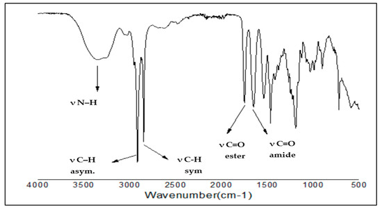 The FTIR spectra of the intermediates (DAEA12-16) showed a strong absorption band at 1634–1643 cm−1, which is characteristic for C=O amide, and a sharp band in the range of 3291–3298 cm−1 for NH stretching. In addition to the distinct intermediate peaks (DAEA12-16), there was a strong peak at 1740–1755 cm−1 which corresponds to the absorption of C=O of the ester group for CGSES12-16 (Table 1, Figure 1).