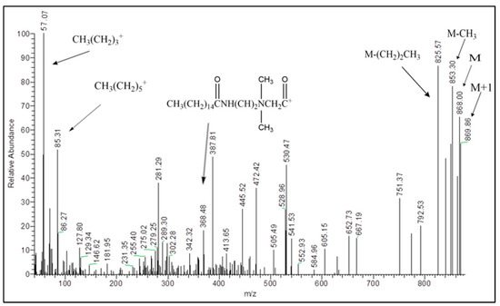 Also, the mass spectra data obtained for all of the studied current cationic gemini surfactants confirmed the chemical composition. The calculated molecular weight m/z values for cationic gemini surfactants (755.948, 812.057, 868.164,) perfectly matched the practical values (755, 812, 868) for CGSES12, CGSES14 and CGSES16 respectively (Table 3, Figure 3). The spectral data figures of the other synthesized cationic gemini surfactants with ester spacer are also provided in ESI (Figures S1–S14).