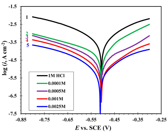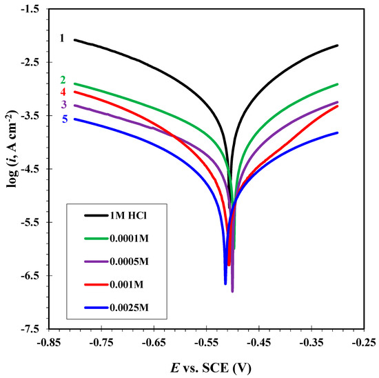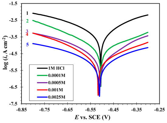 Figure 4, Figure 5 and Figure 6 show the Tafel curves of MS in 1 M HCl in the absence and presence of dissimilar concentrations (0.0001, 0.005, 0.001 and 0.0025 M) of CGSES12, CGSES14 and CGSES16 at 20 °C. The addition of CGSES12, CGSES14, or CGSES16 moved the anodic and cathodic curves to a lower current density. This indicated that the corrosive anodic and cathodic reactions of MS were significantly inhibited by CGSES12, CGSES14 or CGSES16. Also, the Tafel curves match with each other. This indicates the activated control of both cathodic hydrogen permission and anodic ferrous dissolution. The corrosion parameters, like corrosion current density (icorr), corrosion potential (Ecorr), anodic and cathodic Tafel slopes (βa and βc), were calculated using the OrigaMaster 5 software and are listed in Table 4. From the data in Table 4, it can be seen that icorr decreased after adding CGSES12, CGSES14 or CGSES16 to 1 M HCl; it decreased gradually with greater CGSES12, CGSES14 or CGSES16 concentrations. This indicates that CGSES12, CGSES14 and CGSES16 are effective corrosion inhibitors. The corrosion inhibition efficiency () was calculated as follows [31,32]: