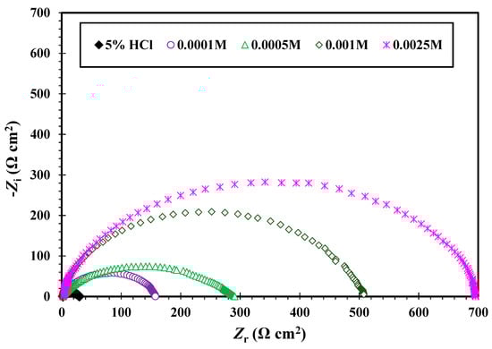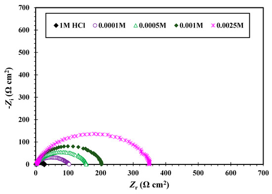 The electrochemical data are summarized in Table 5. It was noted that and increased with increasing concentrations of CGSES12, CGSES14 and CGSES16. was reached at the maximum concentration (0.0025 M), confirming that the inhibitor prevents the charge transfer of the dissolution and H2 evolution processes. was associated with a slower corroding system. and were reached at the maximum concentration (0.0025 M). The and of these materials follow the order: