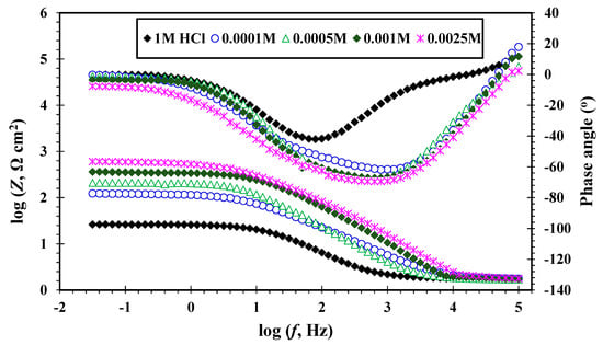 Bode plots for MS in 1 M HCl in the absence and presence of different concentrations of CGSES16 at 20 °C.