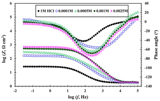 Bode plots for MS in 1 M HCl in the absence and presence of different concentrations of CGSES14 at 20 °C.