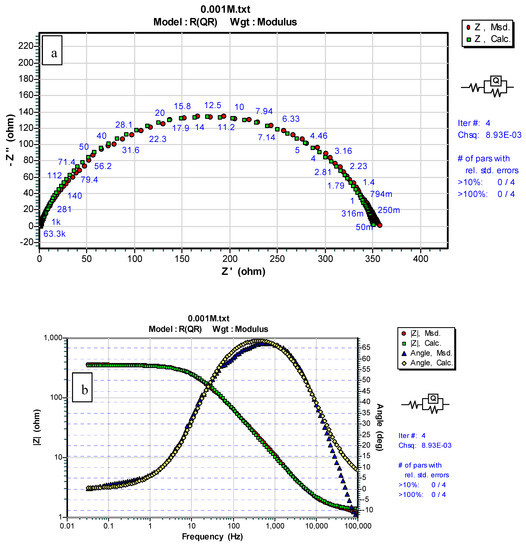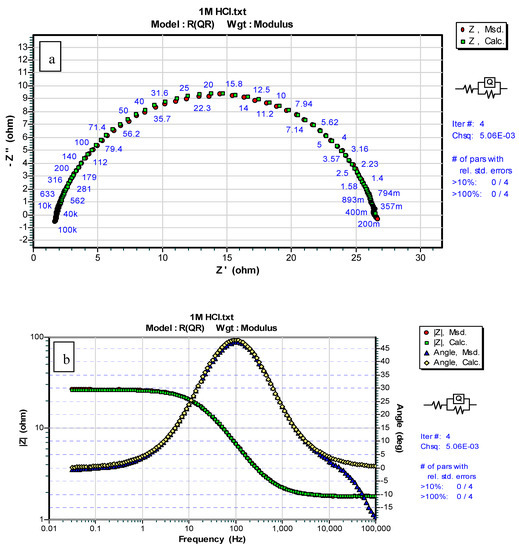 EIS data were simulated using the same circuit as that shown in Figure 13. A simulation of the EIS and Bode plots made using the ZSimpWin software is shown in Figure 14 and Figure 15. It was observed that the values of Chsq (i.e., a measure of the confidence degree regarding the simulations) ranged from 0.00193 to 0.00893. This indicated the correctness of the proposed equivalent circuit. consists of and (dispersion coefficient), where determines the inhomogeneous degree of the MS/solution interface resulting from surface roughness, inhibitor adsorption, porous layer formation, etc. and absolute impedance () can be calculated from the following equation using [41,42]: