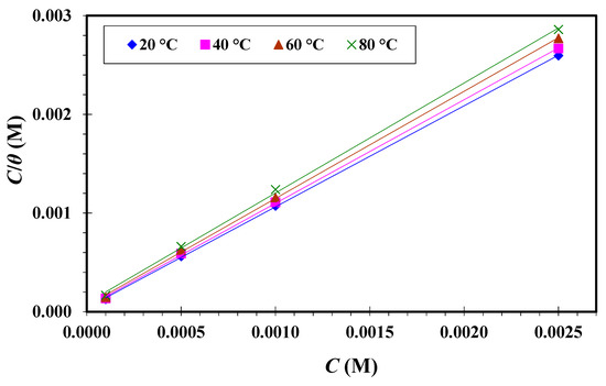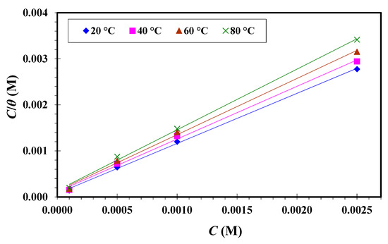 From Table 6, it can be seen that increased while decreased with increasing the temperature from 20 to 80 °C at all tested concentrations for CGSES12, CGSES14 and CGSES16. This was due to desorption mode of CGSES12, CGSES14 and CGSES16 from the MS surface. The maximum value occurred at the maximum concentration (0.0025 M) and at the minimum temperature, i.e., 20 °C, for CGSES12, CGSES14 and CGSES16, respectively. Thus, these compounds may be regarded as effective inhibitors for MS in 1 M HCl. The efficiency of these inhibitors at 20, 40, 60, and 80 °C follows the order: