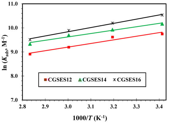By plotting against , the slope refers to . The surfactant concentration at the surface was always higher than that in the bulk solution [65,66,67].