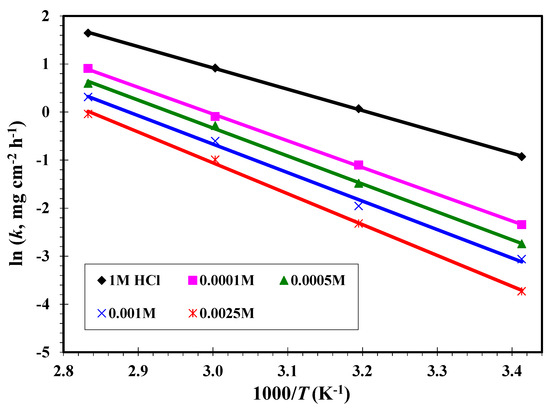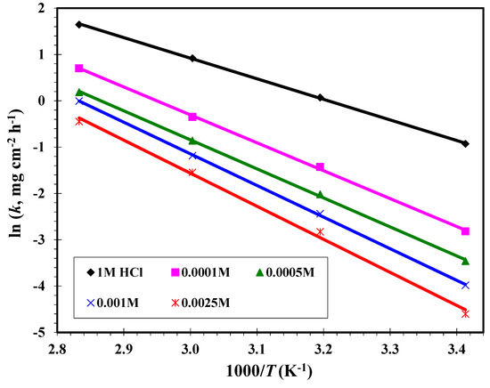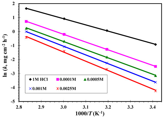 where ΔW is the average WL, is the surface area (cm2), is the time (h), and the corrosion rates of MS in the blank without and with unlike concentrations of inhibitor, respectively. and of MS were determined in the presence and absence of CGSES12, CGSES14 and CGSES16 in 1 M HCl at dissimilar concentrations and temperatures; see Table 6.