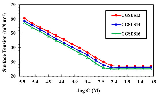 The and values were calculated and are shown in Table 9. It was found that the value increased while decreased with increasing the hydrophobic chain. These results indicate that CGSES12, CGSES14 and CGSES16 are good surfactants.