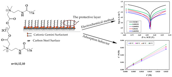 In the petroleum industry, mild steel (MS) is used in production pipelines, flooding systems, storage tanks, production stations, heat exchangers, and so on as a construction material [1,2,3]. MS is chosen for these applications due to its mechanical properties and cheap price compared to other metals like copper, aluminum, etc. [4,5,6]. But the main problem in using MS in the industry is corrosion, especially in industrial processes that used acids for, e.g., industrial cleaning or the acidization of petroleum wells [7,8]. The cost of metallic loss treatment adds to production expenses. Theref7*ore, the protection of MS against metallic loss is important to reduce costs [9,10]. The application of cationic surfactants as corrosion inhibitors decreases the economic burden of mild steel corrosion [11,12,13,14,15]. A literature review shows that cationic surfactants are added in small quantities to acidic solutions to inhibit MS dissolution [16,17,18]. The cost of treatment with surfactants is much lower than that of ordinary organic compounds [19,20,21] because the surfactant molecules move completely from the bulk of the solution to interface between MS and the acidic media when their concentration is less than the critical micelle concentration [22,23,24].