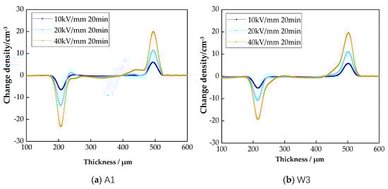 Pulsed electroacoustics was used for the space charge distribution test. The test samples’ thickness and diameter were 300 μm and 80 mm, respectively. Under the 10 kV/mm, 20 kV/mm and 40 kV/mm applied field strengths for 20 min pressure and short-circuit treatment for 30 min, the space charge distributions of the different samples were observed.