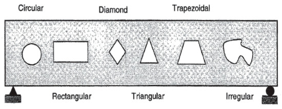 The shear behavior is the main cause that could generate disturbances in internal stresses of the deep beam structure [2,6]. In shear behavior, compression grows in one orientation, whereas tension grows in vertical orientation [6]. As the depth of the beam increases, the shear behavior results in sudden failure [10,24]. Due to the brittle nature, crack propagation in larger size deep beams is much higher than in smaller size deep beams [25]. Failure of deep beams occurs due to crushing of concrete in the compression region of nearby supports or directly along the shear crack formation [10,26]. Khaldoun and Khaled [27] studied the deep beam with a span to depth ratio of 2.5 and observed some reserve strength in the post cracking region, resulting in less brittle behavior [6]. Ashour and Morley [28] concluded that the span to depth ratio of the beam has a significant effect on load carrying capacity, due to horizontal and vertical web reinforcement. The effectiveness of horizontal shear reinforcement in deep beams is much higher than that of vertical shear reinforcement [29]. Russo et al. [30] developed an expression that describes the shear strength of deep beam using the strut and tie model. Diagonal struts, longitudinal reinforcement, vertical stirrups and horizontal web reinforcement are the governing factor in the shear strength of the deep beam. Nair et al. [31] studied deep beams with square and circular shaped openings designed on the basis of the strut and tie model using a finite element analysis. On the basis of the experimental result, circular opening beams offered higher shear resistance than beams with square openings. Similarly, Mansur and Tan [15] stated that transverse openings in the deep beam can be of a different shape and size. However, the most common and preferred openings are square and circular [1]. In 1968, Prentza [32] carried out an extensive research on the various shape and size of transverse opening. Prentza considered different forms of openings, including rectangular, circular, square, diamond, triangular, trapezoidal and irregular shape (Figure 2) [1,32].