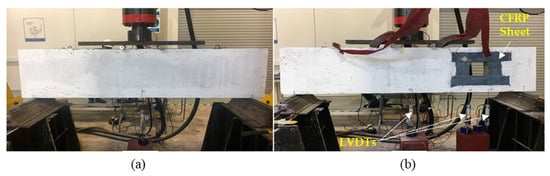 The type of CFRP laminates used in this experiment was the SikaWrap Hex 230C (Sika Kimia Sdn. Bhd., Negeri Sembilan, Malaysia) with 100 mm width on each side. Before applying the CFRP, the surface of the concrete was ground and cleaned using acetone for better adhesion. CFRP was attached around the opening for 1 layer and up to 3 layers for each beam, with an opening following the details in Table 1. Sikadur 330 (Sika Kimia Sdn. Bhd., Negeri Sembilan, Malaysia) a mixture of epoxy resin and adhesive, was used to bond the CFRP to the surface of the concrete. The epoxy was applied twice, before and after attaching the CFRP, to make the CFRP sandwich with the epoxy and ensure that it was strongly bonded to the concrete. Safety gloves and face masks had to be worn throughout the process.