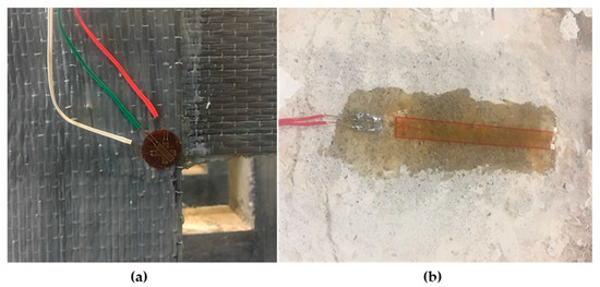 All beams were tested until failure under four-point bending loads with a loading rate of 1 kN/s, using a self-straining loading frame. The load was transferred symmetrically through two loading points, placed at 850 mm away from the edge of the beam. During the test, the beam specimen was placed on two supports, with 100 mm distance from each edge of the beam. In order to observe the beam deflection, linear variable displacement transducers (LVDTs) were positioned at the center of the beam bottom soffit and at the end of the openings (Figure 4). A CFRP sheet was attached around the square opening, located 250 mm away from the point load. The size of the opening was 150, 200 and 250 mm. The CFRP sheet was fully wrapped around the opening, at both the tension and compression zones, to investigate the effective number of CFRP layers used to intercept the diagonal cracking when the load is applied. Rosette strain gauge and uniaxial strain gage were attached at the corner of CFRP and on top of the beam, respectively (Figure 5), by using super glue, after cleaning the surface with acetone. Araldite Epoxy Adhesive glue (Huntsman Advanced Materials, Basel, Switzerland) was used to make a flat surface on top of the concrete, before attaching the uniaxial strain gage. Rosette strain gauge was used to measure the strain of CFRP along 3 different directions, while uniaxial strain gauge was used to measure the strain of concrete in one direction only.