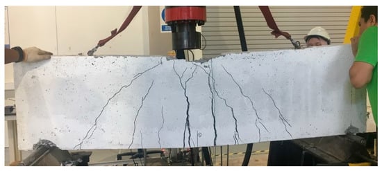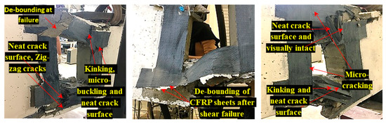 Figure 15 shows the typical failure photos of the deep beams after the static four-point bending tests at a different opening size and various layers of CFRP. It was revealed that the post-mortem photos show major cracks that are localized in the mid-section perpendicular to the fiber direction, and caused de-bounding of CFRP sheets at failure load. In addition, the upper half crack surface caused by compression shows a neat fracture surface at failure of shear load, while the lower half crack surface caused by tension shows a rough zig-zag fracture surface. The upper layers stay visually intact, and the damage is delocalized by many secondary cracks parallel to the fiber direction. At a failure mode, the transition of cracks from the upper layer of micro-buckling to the bottom layer tensile breakage is revealed and led to the formation of extensive micro-cracks when the load is reached at the ultimate point of fracture. On the other side, interlaminar shear failure was not observed, and the only noticed failure was de-bounding, with peeling of the concrete cover between the CFRP sheets and the concrete surface at the failure load.