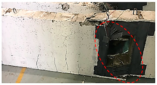 For deep beam B1a, having 1 layer of CFRP around the opening indicates that the sudden diagonal shear cracks occurred until the concrete and CFRP were torn apart, while the bottom rebars were exposed and bent downwards, as shown in Figure 7. The provision of the opening has disturbed the natural load path; hence, CFRP was used to divert the load away from the opening. However, one layer of CFRP is not enough to withstand the stress concentration from the load, resulting in sudden failure and occurred at the opening ends of the deep beam.
