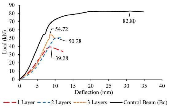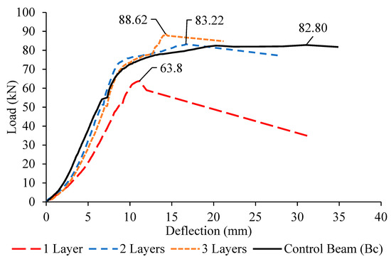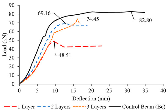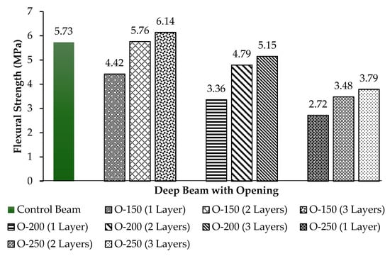 The highest flexural strength exhibited by the deep beam with the opening size of 150 mm and strengthened with three layers of CFRP (Figure 18). This shows that even the existence of the opening had resulted in a shear strength reduction, and that CFRP helps in reserving the flexural strength in a way that can carter the load applied to it. In other words, it helps increase the flexural strength and shear strength capacity. However, with an increase of the opening size, the flexural strength decreases due to low shear strength capacity.