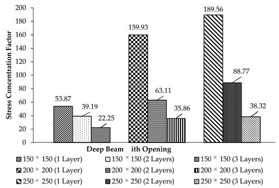 From Figure 20, the largest size of the opening, 250 mm with one layer of CFRP, indicated the highest value of SCF. This shows that the large size of opening experienced high stress in the beam cross-section, and that having one layer of CFRP is insufficient to strengthen the opening and resulted in early failure with low shear strength capacity. By increasing the number of CFRP layers, the stress concentration factor is reduced by 30% to 60%. It can be concluded that CFRP helps in minimizing the risk of stress failure.