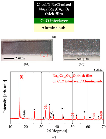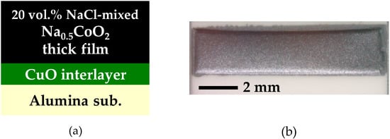 In order to suppress the evaporation of Na, we employed flux sintering using NaCl. Furthermore, the interface between the film and substrate was modified by an insertion of a CuO interlayer in order to improve the adhesion strength. The cross-sectional schematic and the photograph of a partially improved Na0.5CoO2 thick film with NaCl mixing and a CuO interlayer introduction are shown in Figure 2a,b, respectively. NaCl mixing drastically changes the appearance of the film to be free of cracks, and more importantly, the decomposition was totally prevented. As expected, the CuO interlayer introduction improved the adhesion strength and prevented the peeling of the thick film.