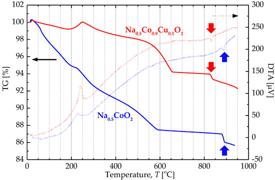 Thermogravimetry/differential thermal analyzer (TG/DTA) curves of Na0.5CoO2 and Na0.5Co0.9Cu0.1O2 powders.