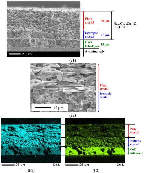 The cross-sectional SEM observation image of the Na0.5Co0.9Cu0.1O2 thick film is shown in Figure 5(a1). The well-sintered CuO interlayer with a thickness of approximately 15 μm is clearly observed on the alumina substrate, on which the Na0.5Co0.9Cu0.1O2 layer with a thickness of 50 μm is laminated. No cracks can be observed, and all layers are firmly adhered. It is noteworthy that the Na0.5Co0.9Cu0.1O2 layer clearly separates a 30 μm-thick plate-crystal layer from the surface and a 20 μm-thick isotropic-crystal layer near the CuO interlayer. Figure 5(a2) shows an enlarged image of the interface between the layers. So far, preferential growth of Na0.5CoO2 has been reported in the templated grain growth process using NaCl flux [25] as well as hot-forged sintering [26], leading to the well-aligned microstructure along the ab-plane. In our Na0.5Co0.9Cu0.1O2 thick film, the mixed NaCl would have acted as a flux that promotes the crystal growth of Na0.5Co0.9Cu0.1O2. This leads to the growth of plate-crystals, reflecting its layered crystal structure and crystal orientation along with the interface. Typically, cracks in printed thick films are caused by the mismatch between the sintering shrinkage of the film and in-plane constraint from the substrate. Then, brittle ceramic materials are hard to sinter into crack-free thick films (compared to metallic materials that can deform). On the contrary, in our flux sintered thick film, the crystals grew in the in-plane direction of the film, supporting the anisotropic sintering of the film in such a way that effectively suppressed crack formation. Notably, with both the layered crystal structure of Na0.5Co0.9Cu0.1O2 and the crystal growth with NaCl flux, the isotropic crystal growth of Na0.5Co0.9Cu0.1O2 just above the CuO interlayer is rather unnatural.