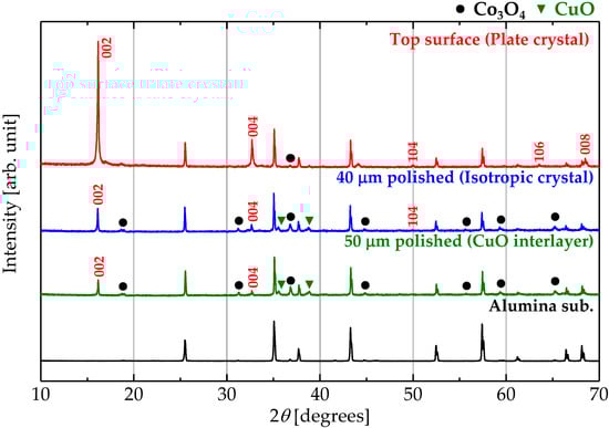 In order to identify the compounds contained in each layer, the thick film was polished from the surface, and each exposed layer was measured by XRD. Figure 6 shows XRD patterns of each layer. The indexed peaks and the unassigned peaks correspond to the Na0.5CoO2 phase and alumina substrate, respectively. The peaks of the Na0.5CoO2 phase are located at the same angle in all layers. There are peaks of CuO in addition to the peaks of the Na0.5CoO2 phase in the isotropic-crystal layer, and Co3O4 observed in the plate-crystal layer. Hence, the Cu-rich impurity observed in the elemental mapping image is CuO, and the isotropic-crystal layer is a composite of Na0.5Co0.9Cu0.1O2, Co3O4, and CuO. CuO forms large grains because Cu-rich grains are relatively large in the mapping image. Such CuO with a C12/c1 space group of monoclinic should form isotropic grains and may act as a grain growth inhibitor for Na0.5Co0.9Cu0.1O2, resulting in the isotropic Na0.5Co0.9Cu0.1O2 crystals. The origin of Cu-source that form CuO grains should be the CuO interlayer exuded as a liquid phase or dissolved in NaCl flux, since the Cu concentration in Na0.5Co0.9Cu0.1O2 is much lower than that of CuO. Co in the CuO interlayer formed Co3O4.