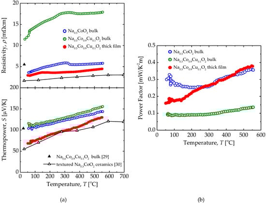 The thermopower of the Na0.5Co0.9Cu0.1O2 thick film was lower than that of the bulk samples. The thermopower has been reported to be enhanced by a Co–Cu substitution in Na0.5CoO2, and increased with increasing Na content in a previous study [29,31]. As shown in Figure 7a, Na0.5Co0.9Cu0.1O2 bulk shows higher thermopower than the Na0.5CoO2 bulk. The thermopower of the Na0.5Co0.9Cu0.1O2 bulk reported by Park et al. has exceeded 400 µV/K at 600 ℃ [22], and it is much higher than the other reports and the theoretical value calculated from the Heikes formula with the valence ratio of Co3+:Co4+ = 1:1 [32,33], but the reason for this is not clear. Nevertheless, the Na0.5Co0.9Cu0.1O2 thick film, which is expected to be a Na-rich composition with Co–Cu substitution, shows lower thermopower than the Na0.5CoO2 bulk.