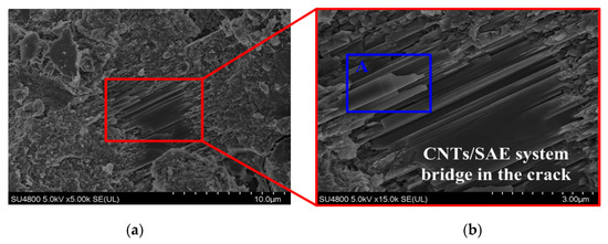 Figure 12 shows the defects of the HSPC incorporating 0.1 wt.% CNT–OH and 15 wt.% SAE after 28 days of curing. Figure 12a,b clearly reveals the interaction of the SAE and CNTs. The CNTs are coated by an SAE film, and CNT/SAE networks bridge over the cracks and fill the pores, leading to a dense microstructure. Compared with the HPC (Figure 10) and SPC (Figure 11) groups, the morphology of the hardened HSPC shows fewer pores and cracks. The formation of abundant CNT/SAE networks and the dense microstructure of HSPC can probably improve the toughness of cement paste, further study is worthy to be conducted. In addition, Figure 12c (enlargement of point A in Figure 12b) shows that, as compared with HPC (Figure 10), the distribution of CNTs was more uniform and fewer entanglements and agglomerations could be found in HSPC. Moreover, from Figure 12c, it can be found that CNTs coated by polymer film adhere tightly to the cement matrix, indicating the strong interaction among CNTs, SAE and cement hydration products. Furthermore, it can be seen from Figure 12d that some CNTs/SAE networks are embedded in cement matrix, leading to the reduction of the pore size as demonstrated by the MIP test, as shown Figure 8 and Table 5. In short, the cement paste incorporating the CNTs/SAE hybrid solution had a more uniform and denser microstructure than that incorporating CNTs or SAE alone, thereby, the hybrid addition of CNTs and SAE is more effective in enhancing the flexural strength and water resistance of cement composites, as shown in Figure 6 and Figure 7.