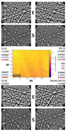 Projection center (PC) pattern matching results for the corner points of the map. The experimental patterns are marked by “E” and the corresponding best-fit simulations are shown by “S”. The best-fit PC values are shown in color, below the beam scan indices and the value of the normalized cross-correlation coefficient r. In agreement with the geometry of the scan relative to the EBSD screen [4], the Kikuchi patterns can be seen to move to the left with increasing , and upwards with increasing . Because the vertical movement with increasing also moves the beam away from the screen on the tilted sample, increasing PCZ, the patterns in the lower row also appear magnified, as can be seen by the slightly broader Kikuchi bands. The full map of r-values resulting during the final orientation refinement shown in the center.